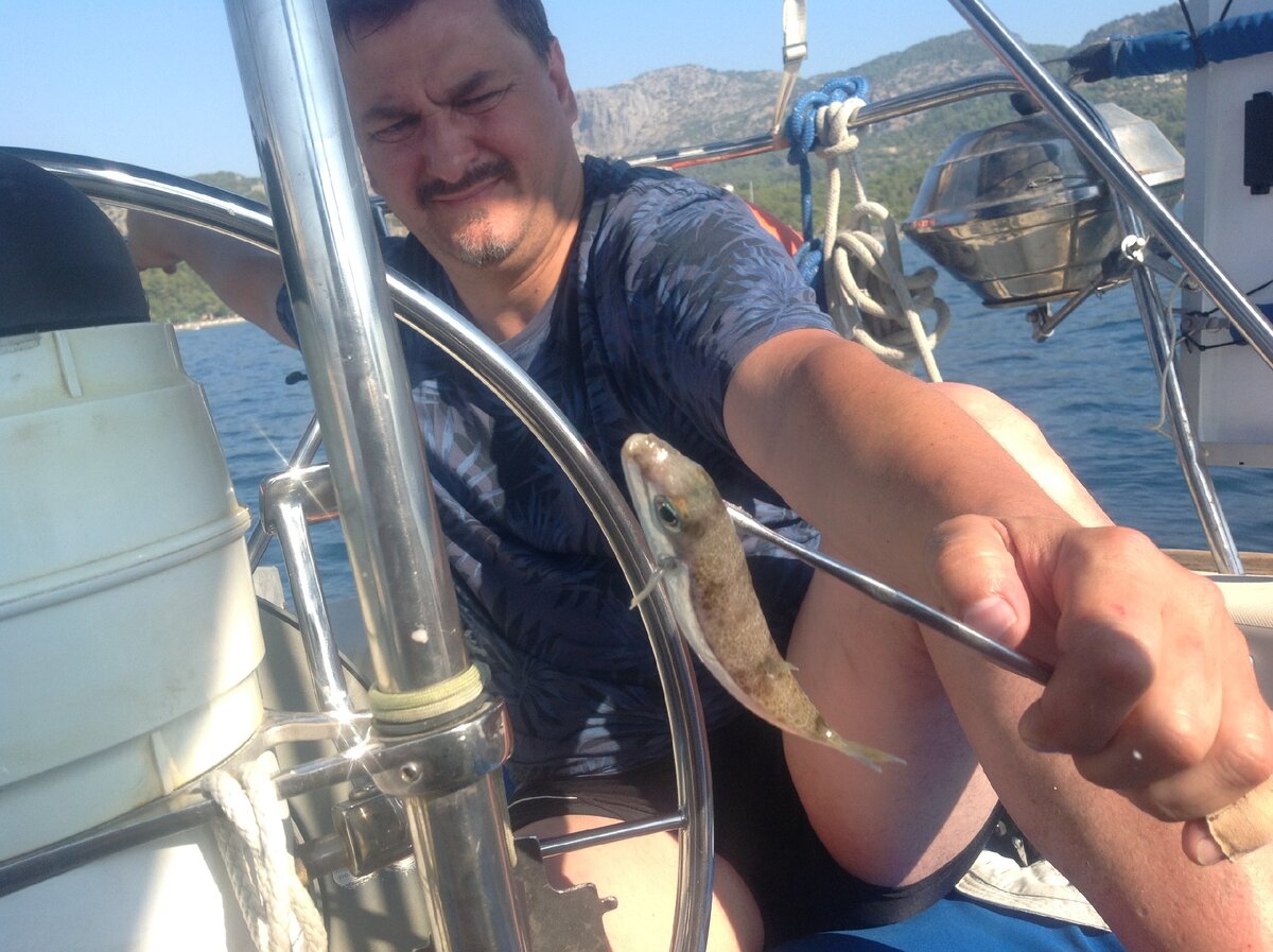 За час махания удилищем пара пустых поклевок и одна рыбка. Андрею повезло. Бог его знает, что это на самом деле, но предположил фугу. Осмотрели, сфотографировали и выпустили. Когда турки отрыбачились, свернули снасть и мы. Пошли на Мармарис. За собой тащим воблер.