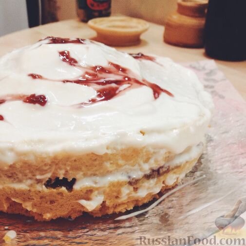 Поставить в микроволновку. У меня максимальная мощность - 700 Вт, я ставила на 7,5-8 минут. Бисквит хорошо поднимется. Вытащить, пусть остывает. Далее сметану смешать с сахарной пудрой. Бисквит разрешать пополам на коржи, нижний смазать вареньем, верхний - сметаной. Убрать в холодильник.