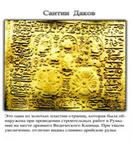 Своим потомкам Даки послали послание из 2000-летней давности: в 17-м веке на месте древнего Ведического Капища, было обнаружено около четырёхсот золотых пластин с древними письменами, которые получили название Сантии Даков. Румынский король Карл I, приказал переплавить большую часть этих пластин, чтобы пополнить свою пустую казну, но, перед переплавкой, он приказал сделать точные свинцовые копии переплавляемых золотых пластин-страниц. (www.via-midgard.info).