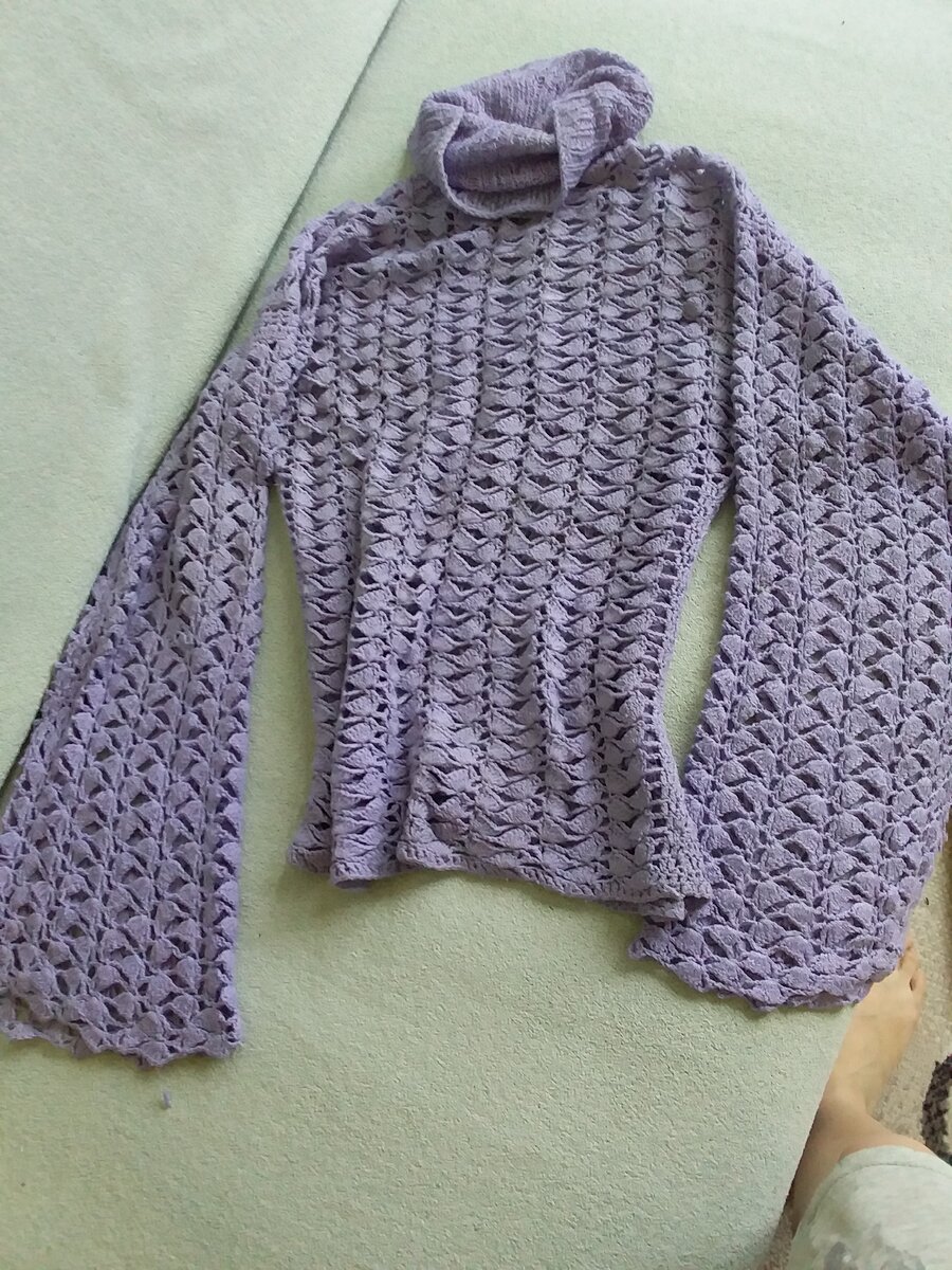 Кофту связала и носила, когда училась в институте. Из-за нее мне пришлось дополнительно готовить реферат. Громко что-то рассказывала подруге на паре и смеялась. Преподаватель сказал: "А девушке в сиреневой кофте дополнительно реферат на тему рекламаций. Иначе зачет не поставлю." С того случая препод всегда делал мне замечания. Запомнилась видимо хорошо.