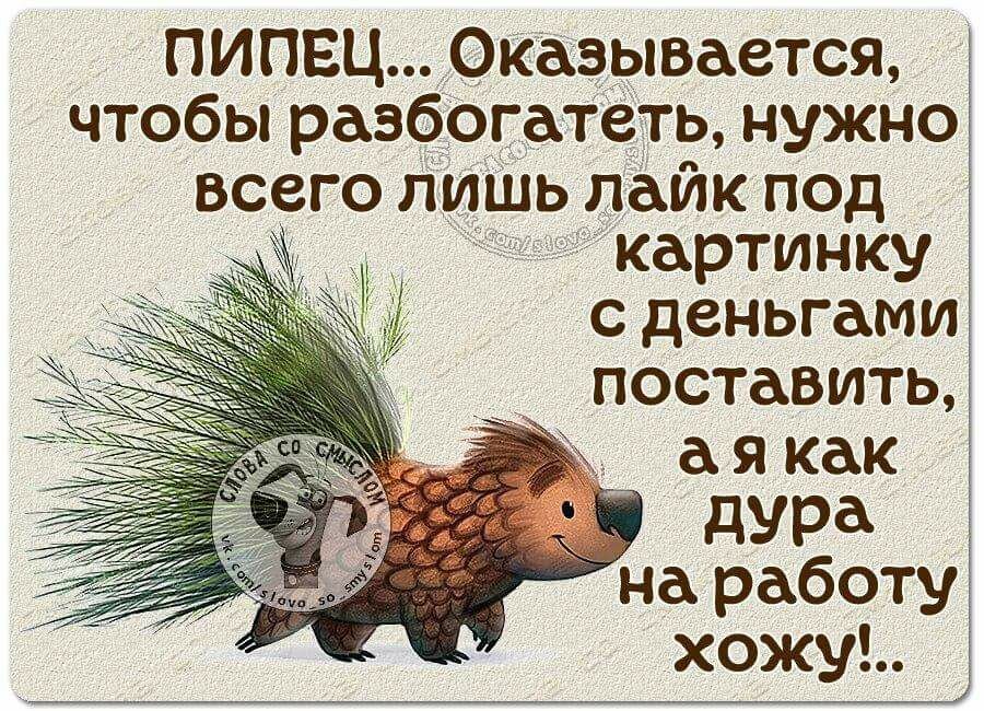 Из чата питерских предпринимателей: - Привет! Кто может помочь с открытием кофейни? - Попробуй дверь на себя. *** Она - ему: - Ты говоришь, как идиот. Он: - Я говорю так, чтобы ты могла меня понять. *** - Девушка, а сколько вам лет? - А сколько вы мне дадите? - Две тысячи и после секса ещё и посуду помоешь. *** - Девушка, а вы не боитесь садиться в машину к незнакомому мужчине? - Обычно, я боюсь проговориться, что еду к венерологу. *** - Лена, куда делась бутылка водки? - Я обрабатывала рану. - Какую еще рану?! - Душевную. *** Лайфхак: Если вы устали и сильно хотите спать, а у вас дома очень шумные дети, попросите их разбудить вас через 30 минут, чтобы начать совместную уборку дома. Они сделают всё, только бы не разбудить вас. *** Разговаривают два приятеля: — Вижу, твоя машина постоянно стоит у подъезда. Никуда не ездишь, не сломалась? — Да нет. Понимаешь, я так хорошо ее припарковал, что боюсь уеду и кто нибудь место займет. *** Квартирант выговаривает хозяйке: – Это просто без