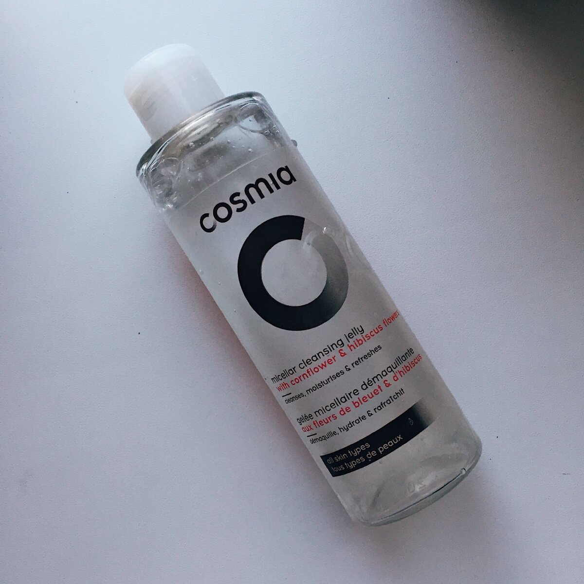Начнём «по классике», со снятия макияжа. Конечно, сейчас я практически не крашусь. Использую только карандаш для бровей и редко консилер, но кожу очищать все же надо. Нашла гель для снятия макияжа на основе мицеллярной воды «Cosmia» в Ашане, стоил ~150 рублей. Судя по отзывам на разных сайтах, многим он не нравится, мне же наоборот. Средство неплохое, особенно за такие деньги. Запаха васильков почти нет, но «химозности» не заметила. Снимает «легкий» макияж очень хорошо. Если на глазах у меня очень пигментированные тени, то этот гель наношу на ватный диск. Кожу не сушит, даже слегка увлажняет. Хорошая альтернатива мицеллярной воде (мне она уже как-то поднадоела). Думаю, куплю ещё один и отвезу на дачу.