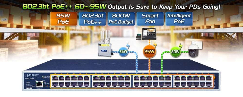 Компания Planet выпустила обновленную версию двадцатичетырехпортового промышленного инжектора UPOE-2400. Новая модель получила 8 портов, которые поддерживают подключение 95-ваттных оконечных устройств 802.3bt. Производитель позиционирует инжектор как решение, которое позволит развернуть сеть IP-видеокамер или точек беспроводного доступа с подачей питания по технологии PoE. Инжектор собран в стальном корпусе, который предназначен для монтажа в 19-дюймовую стойку. На передней панели инжектора расположены 24 входных порта 10/100/1000BASE-T и 24 выходных порта 10/100/1000BASE-T с PoE 802.3bt. Бюджет PoE состаляет 800 Вт и в зависимости от количества и мощности подключаемых устройств, инжектор может работать в различных режимах. Во-первых, все порты могут работать как 36-ваттные. При подключении 95-ваттных устройств работает первых 8 портов. Оставшиеся 16 позволяют подключать 60-ваттные устройства в рамках соблюдения бюджета. Помимо 24 входных и 24 выходных портов, на перед