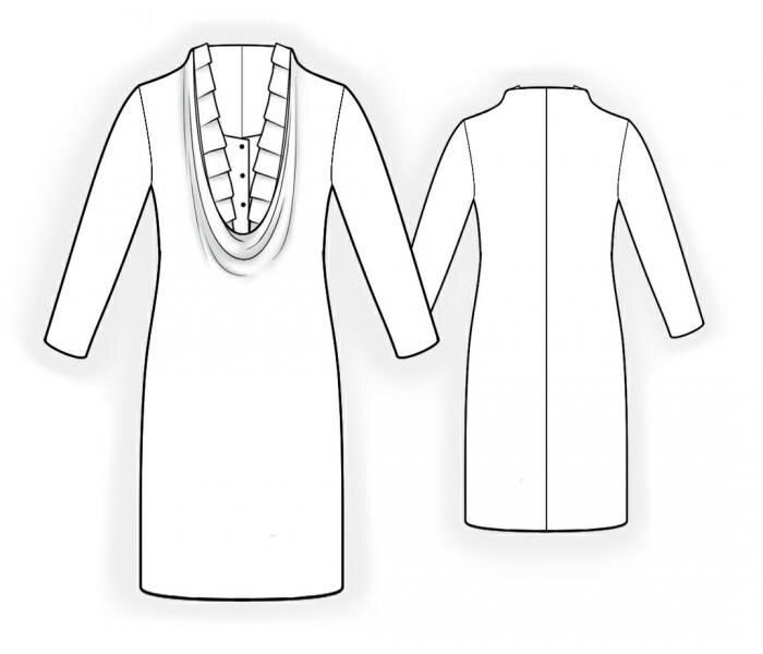 посмотреть модель на сайте 5940 ПЛАТЬЕ С ГОРЛОВИНОЙ КАЧЕЛЬ РЕКОМЕНДАЦИИ ПО ВЫБОРУ ТКАНИ: трикотаж малой или средней степени растяжимости из натуральных или смесовых волокон, белая блузочная ткань (х\б). А ТАКЖЕ ВАМ НЕОБХОДИМО: клеевой флизелин, 4 пуговицы. ЕСЛИ НА ЛЕКАЛАХ ДВОЙНОЙ КОНТУР, ТО ЛЕКАЛА ДАНЫ С ПРИПУСКАМИ НА ШВЫ, ЕСЛИ КОНТУР ОДИНАРНЫЙ, ТО ЛЕКАЛА ДАНЫ БЕЗ ПРИПУСКОВ НА ШВЫ. ПРИПУСКИ НА ШВЫ: припуск по низу изделия, низу рукава – 1.5 см, по горловине спинки и полочки платья – 1.5 см, по нижнему срезу боковой части блузки – 1.5 см, вдоль одного продольного среза оборки — 1.5 см. Остальные швы 1 см. ВНИМАНИЕ! ПРЕЖДЕ ВСЕГО, РАСПЕЧАТАЙТЕ БУМАЖНЫЕ ВЫКРОЙКИ И РАЗЛОЖИТЕ ИХ НА ШИРИНУ ТКАНИ (ширина ткани может быть от 90 см до 150 см) ДЛЯ ТОГО, ЧТОБЫ ВЫЯСНИТЬ, СКОЛЬКО МАТЕРИАЛА ВАМ ПОТРЕБУЕТСЯ. ПРИ СТАЧИВАНИИ ДЕТАЛЕЙ ОБРАЩАЙТЕ ВНИМАНИЕ НА НАДСЕЧКИ - ОНИ ДОЛЖНЫ СОВПАДАТЬ! РАСКРОЙ: Из трикотажа: 1. Спинка – 2 детали 2. Полочка - 1 деталь со сгибом 3. Рукав – 2 детали Из блузочной