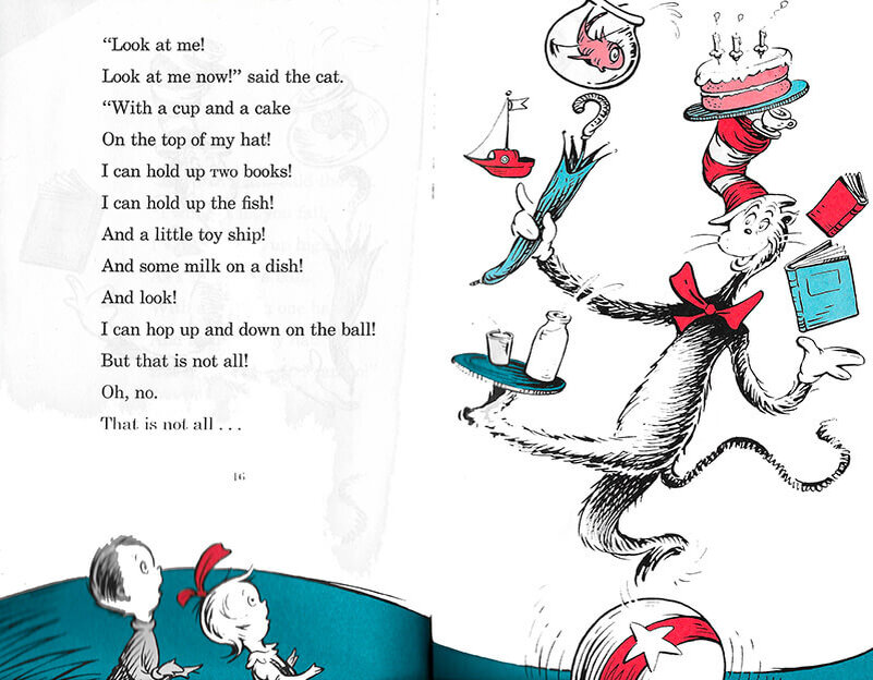 Пик популярности книг Теодора Гейзеля приходится на 1957 год, когда появилась книга для начинающих читателей «Кот в шляпе» (THE CAT IN THE HAT), которая интриговала и обещала принести удовольствие от процесса обучения чтению. Что касается цифр, то они везде разные, но основная идея в том, что Теодор Гейзель получил заказ на создание книги с определенным набором слов, которые должны знать дети. Часто можно встретить версию, что это задание он получил от своего издателя. Мне нравится следующая версия. В середине 1950-х годов в США были опубликованы несколько статей о неграмотности американских детей. Автор одной из этих статей, Уильям Сполдинг (William Spaulding), бросил вызов Сьюзу: сделать книгу, которую 6 — 7-летние дети могли бы читать самостоятельно. Сполдинг дал ему список из 225 слов, которые Сьюз мог использовать для этой книги. В каком-то интервью Сьюз заявил, что первые два слова из этого списка, которые рифмуются, станут названием для книги. Этими словами оказались "cat" (к