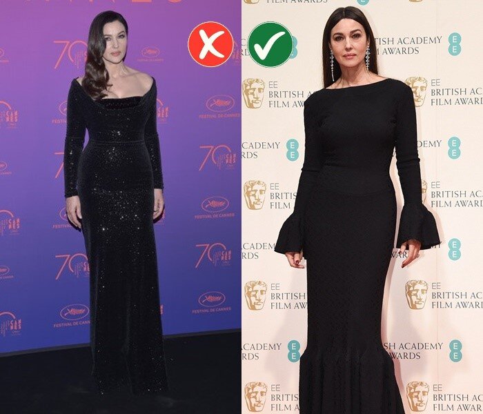За годы на красных дорожках Моника создала и укрепила образ себя как женщины в платье прилегающего силуэта, который безупречно держит её фигуру. Она всегда любила корсеты, и очень редко носила наряды из лёгких струящихся тканей. И совершенно правильно, потому что такие модели негативно презентуют образ актрисы, подчёркивая массивность фигуры, делая её визуально рыхлой и бесформенной.