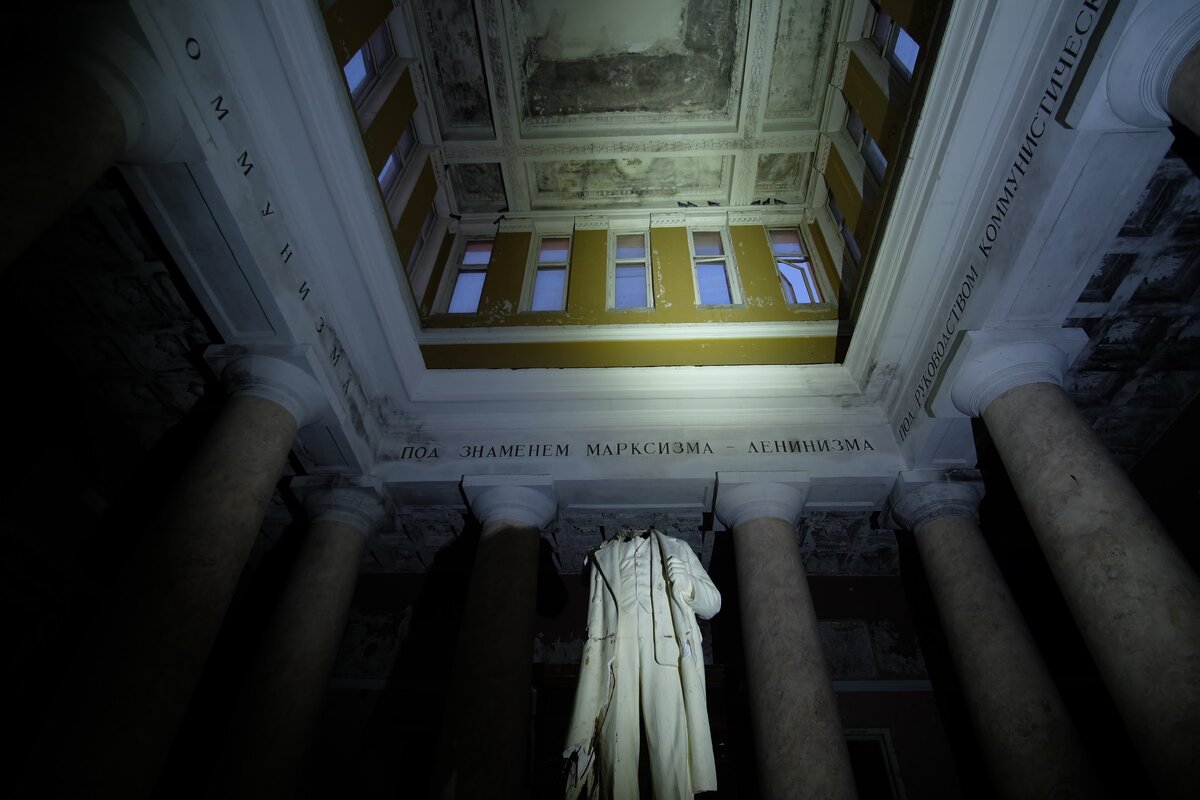 И в заключение - "мертвец" в военном ангаре - тоже Владимир Ильич, пусть и в очень плачевном состоянии. Головы нет, огузок сломан, ноги побиты. Входя в ангар, его легко принять в темноте за настоящий труп.