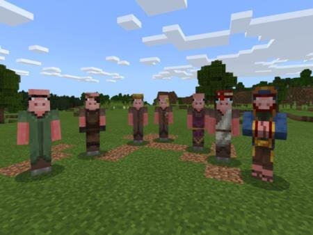 Не всем нравится вид деревенских жителей в Майнкрафт Бедрок. Лысые и носатые сельчане никого не привлекают, поэтому разработчики придумали способ сменить внешний вид сельчан с модом Pig Villagers. Дополнение меняет сельчан на свинолюдей. Страшные существа из ада теперь будут ожидать игрока и в деревнях. Мобы получили кастомные текстуры для различных профессий сельчан. Кроме этого, аддон добавляет две новые профессии в игру. Поскольку деревня не всегда защищены железными големами, разработчики добавили защитников - деревенского стрелка и война, которые будут охранять сельчан от атак мобов. Так же добавили нового моба - Голиафа - страшного и гигантского существа. В Нижнем Мире будет представлена аналогичная зомби-версия Голиафа. Дополнение затронет не только сельчан, но и разбойников. Помимо текстур, разбойники получат усиление в виде Иллюзиониста - нового моба, который существует в Java версии игры. Моб не ведет себя аналогично Java версии, поскольку разработчик добавил собс