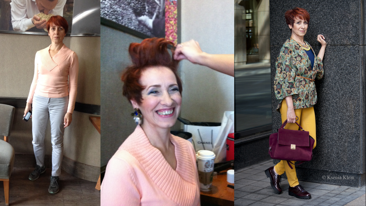Бывают "женщины-юбки" и "женщины-брюки". Татьяна явно второй вариант, поэтому на шоппинге мы только их и покупали. Плюс восточная основа внешности позволяет немыслимые сочетания цветов в комплектах, даже желтый, а он мало кому идёт, разве что Амаль Клуни. Татьяна явно не из тех, кто будет носить каблуки, поэтому мы выбрали обувь на плоской подошве. Но не совсем на плоской, чтобы не скатываться в банальность. Бордовый+синий+зеленый это классическое сочетание цветов, которое всем идёт, и с него я всегда рекомендую начинать свой путь клиентам. В этих цветах море оттенков, вы наверняка найдете свои. Практически везде есть шарфы, чтобы красиво оформить линию шеи, без шарфа она выглядит простовато. Сейчас, конечно, я бы просто одела её в бренды, но тогда масс-маркет казался единственным решением, подходящим по бюджету. Очень важной частью образа являются аксессуары и правильная прическа (тут статья стала назидательной)), но это рили важно. татьяна специально к фотосессии красила и отращивала