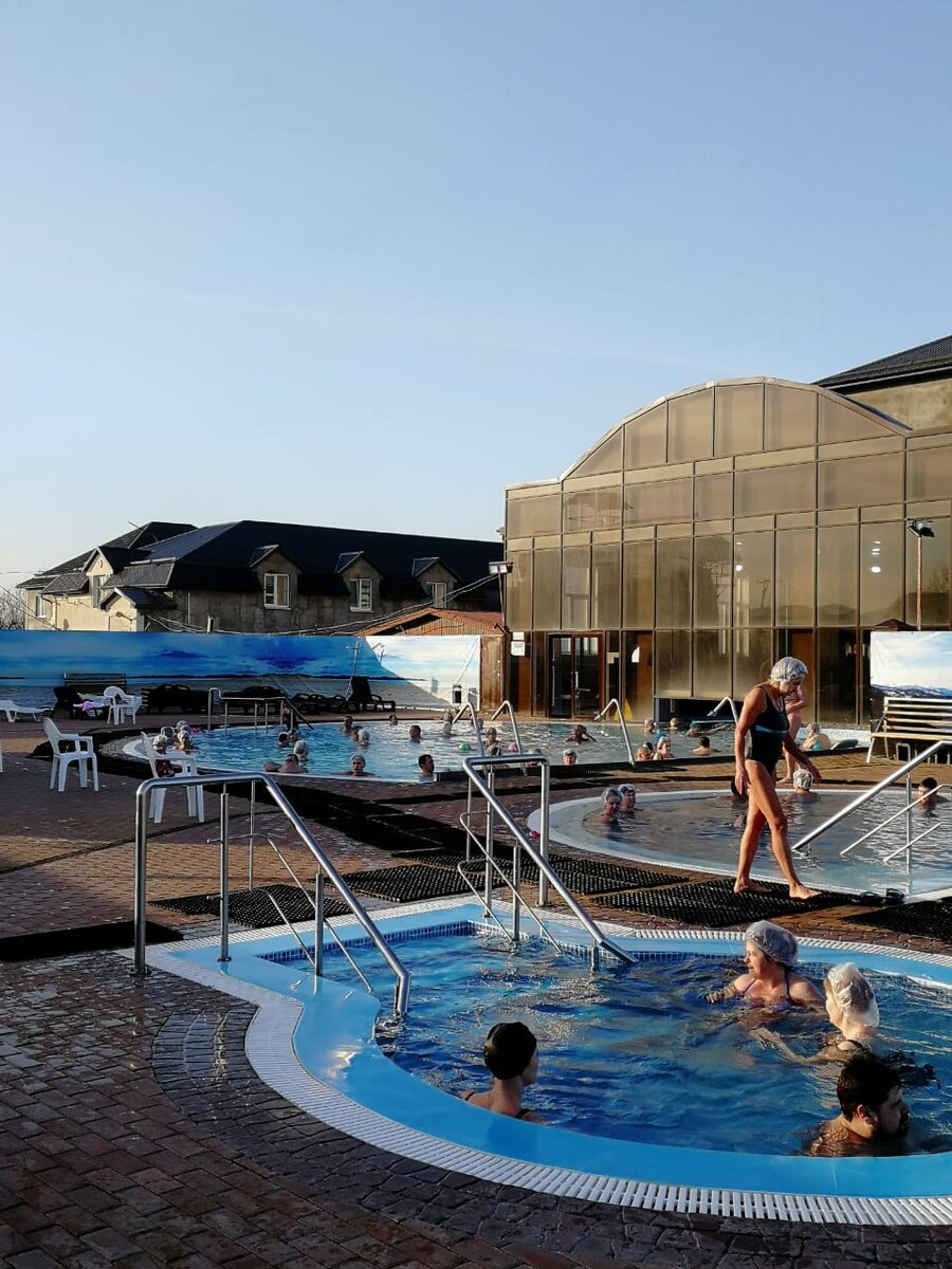 Здесь 4 бассейна: большой открыто-закрытый с температурой воды около 37 градусов, два средних по размеру бассейна с водой 40 и 22 градуса, маленький (на переднем плане фото) с водой около 19 градусов. В день моей поездки на улице было +10-12С (февраль), так что было вполне комфортно. Летом по жаре не уверена, что будет очень приятно)