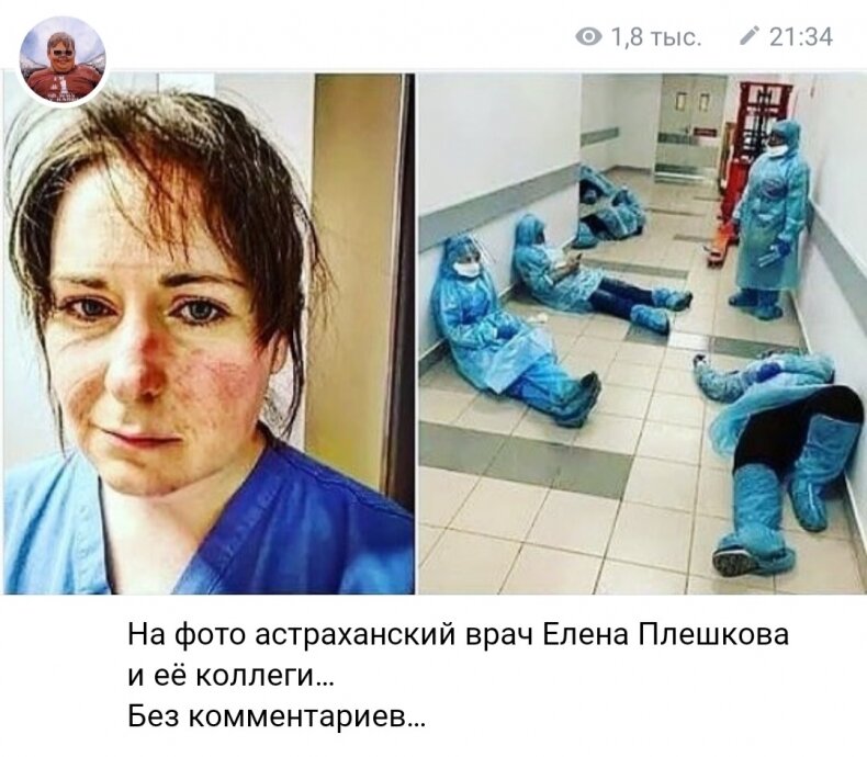 В одном из анонимных Telegram-каналов появилась фотография якобы из астраханской больницы, где находятся пациенты с COVID-19. Снимок сопровождается неоднозначной подписью: «На фото астраханский врач Елена Плешкова и её коллеги». Вся эта история не соответствует действительности, заявил зам. начальника отдела по связям с общественностью Минздрава Астраханской области Алексей Васильев: «Друзья, к сожалению, у нас ежедневно возникают фейки. Во-первых, это не астраханская больница, и вообще, больница ли это? На фотографии на заднем плане стоит погрузчик, я, честно, ни разу не видел таких приспособлений в больницах. Во-вторых, в Астрахани с такой фамилией и именем работает только один медработник. И это не она на фотографии, я лично с ней встретился!» – написал Алексей в своём аккаунте в социальной сети.