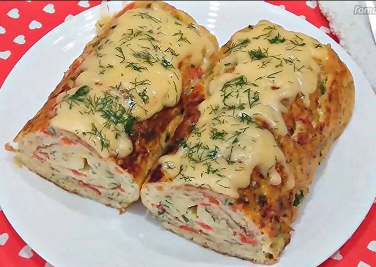 - Сдвигаю на край сковородки, а оставшуюся часть сковороды опять заполняю омлетом. Даю схватится, переворачиваю готовый рулетик на сырую основу, чтобы не подгорел, и накрываю крышкой. Опять жарю 3-4 минутки и так до конца. Когда вся смесь закончится сверху посыпаю оставшимся сыром и посыпаю укропом. Делаю самый маленький огонь. Жду пока расплавится сыр, примерно 2 минуты и выкладываю на тарелку. Режу на порционные кусочки и подаю к столу.