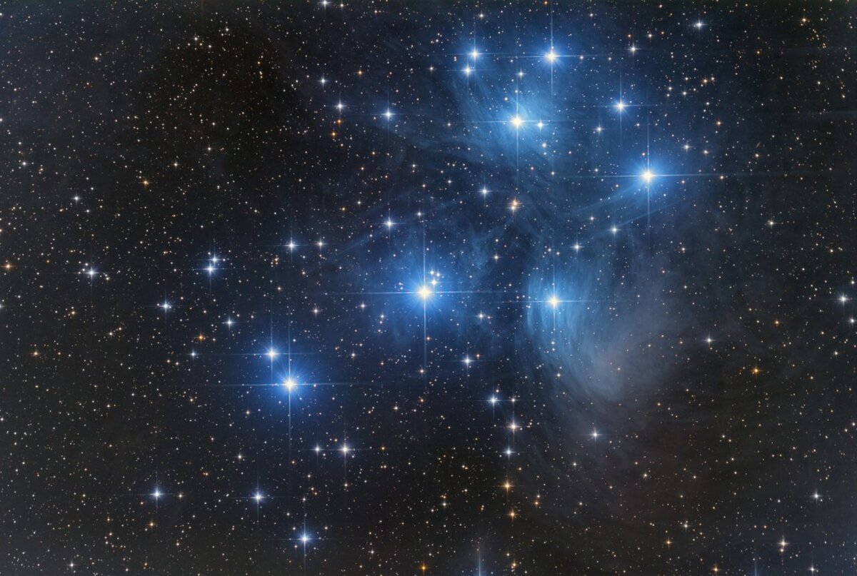 m45, съемка 8-10.10.2018 пригород Таганрога, общее накопление 460мин 46×10мин, 200 iso, флэты. 30% оригинала,Камера Nikon d810a, монти eq8, 60f4 + qhy5ii-l, телескоп 250f4, калибровка/обработка в pixinsight.