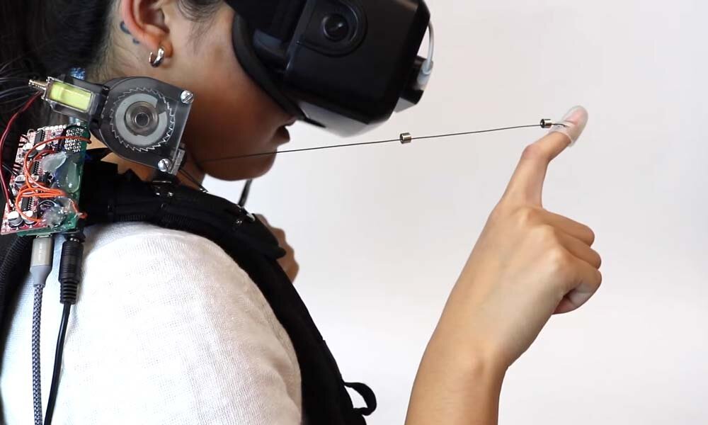 Тактильная система Wireality предназначена для имитации виртуального сопротивления пальцев. Однако визуально к этому нужно привыкнуть. Современные аудиовизуальные системы и системы отслеживания движения в VR значительно опережают предыдущие модели. Однако в моделировании тактильных ощущений почти ничего не произошло за последние десятилетия: даже дорогие, высококачественные системы ограничиваются простыми вибрационными двигателями в контроллере. Нет недостатка в идеях для тактильного моделирования, постоянно поступают новые предложения от исследовательских лабораторий. Но пока еще ни одно из них не было готов к выходу на рынок. Может быть, пришло время? Эдвард «Руки-верёвки» Исследователи из группы «Интерфейсы будущего» в Университете Карнеги-Меллона в Питтсбурге разработали Wireality специально для взаимодействия рук и пальцев с виртуальными объектами. Визуально система делает следующее: стальные тросы с покрытием из нейлона на кончиках пальцев, ладонь и запястье ведут к пружинному