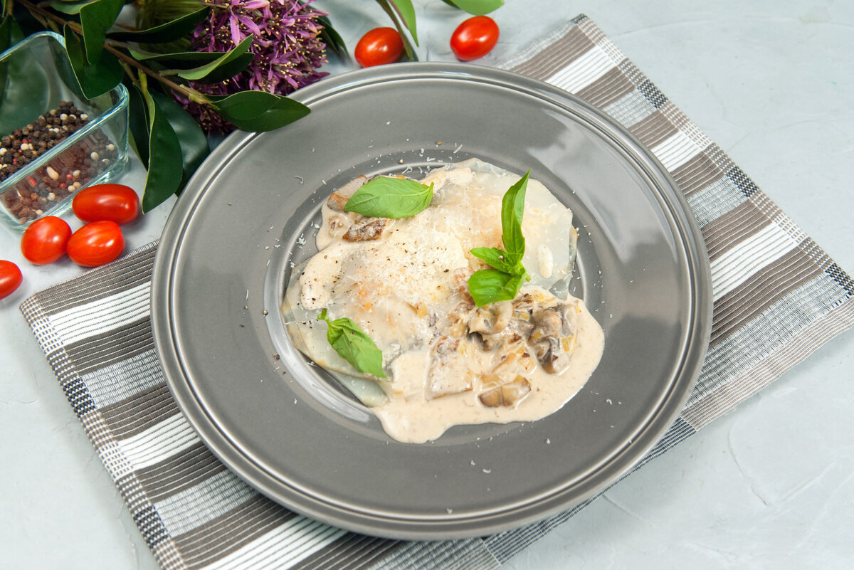 Равиоли из корня сельдерея с индейкой и соусом из грибов