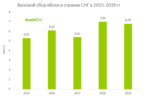 В 2015-2019 гг валовой сбор яблок в странах СНГ вырос на 28%: с 5,3 до 6,8 млн т.