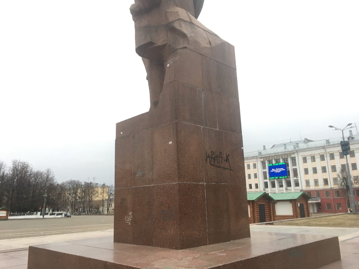 Весь исписан граффити, абсолютно весь. Как сейчас выглядит памятник Ленину на Театральной площади
