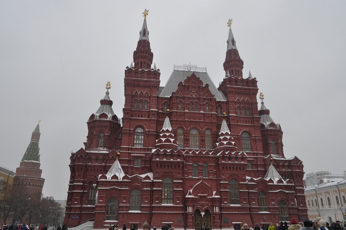 Какая Москва без Красной площади и Кремля? Подумали мы и решили посвятить этому месту целый день 2 января, а народу довольно много. Хотя по московским меркам, я подозреваю, что это мало Вдоль кремлёвских стен Всё-таки есть какой-то шарм в зимних поездках Также к нашему удивлению мы узнали, что Мавзолей работает. Само посещение бесплатно, однако, в очереди к Вождю мы потеряли около часа. Фотографии там запрещены, но я считаю, что Мавзолей нужно посетить. А так как на сегодня планов больше не было, то продолжаем гулять Посетили ГУМ просто из-за того, что где-то, что-то, как-то слышали это название Когда мы вышли на улицу уже стемнело Ну и после ужина, как обычно, вечерняя прогулка День 5 ->