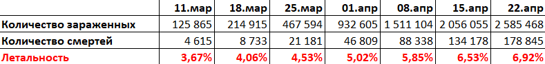 На сегодняшний день нет единого понимания о мировой летальности от COVID-19. К сожалению, уже понятно, что она не сопоставима с обычным ОРВИ –менее 1,0%. Но всё-таки какой процент летальности при заражении новым коронавирусом? В большинстве СМИ летальность считают как показатель равный отношению числа умерших к общему числу заболевших. Эти цифры мы видим в большинстве официальных отчетов. Такой расчет летальности можно будет считать корректным, но только после того как эпидемия закончится и понятно будет конечное число зараженных людей и смертей от вируса. А пока мы наблюдаем еженедельный процентный рост показателя от 1-3 процентов в начале эпидемии и до текущих 6%. Внутри эпидемии и особенно в стадии роста количества зараженных, летальность нужно считать как отношению числа умерших к числу переболевших (выздоровевших). Ведь это логично, для расчета не важно количество болеющих в данный момент. Важно сравнить сколько человек полностью выздоровело с умершими. Это и есть реальная ци