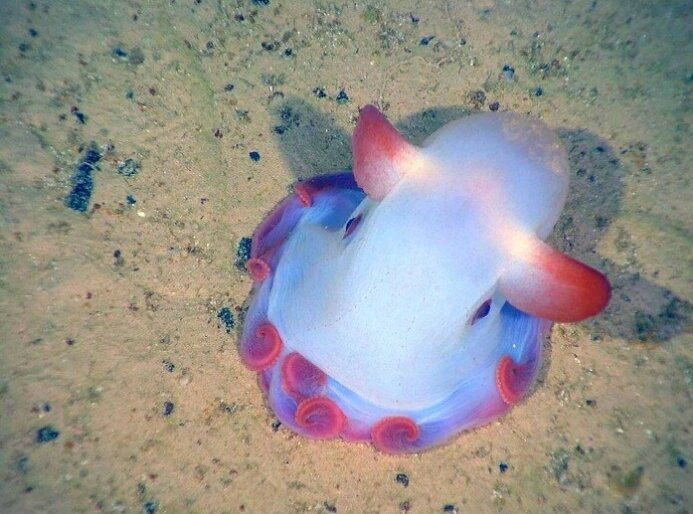 Открывает хит-парад удивительных созданий забавный осьминог. Он живет на больших глубинах (от ста до пяти тысяч метров) и занимается преимущественно поиском ракообразных и червеобразных на морском дне. Свое название, напоминающее о слоненке с большими ушами, осьминог получил благодаря двум плавникам необычной формы.