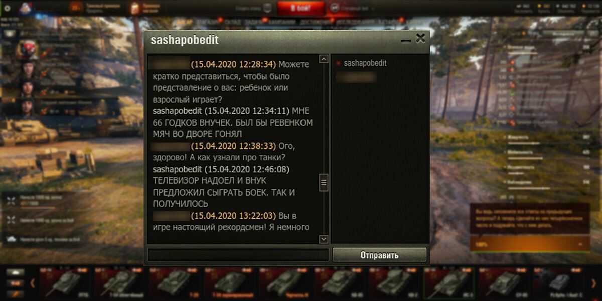 Всем привет! Для кого-то World of Tanks просто игра, для кого-то работа, а для игрока под ником sashapobedit это целая жизнь! У него рекордные 252 тысячи боев в игре, больше - ни у кого нет. У меня 28 тыс. боев на аккаунте, хотя я вроде как играю много, а у него 252 тысячи, просто в голове не укладывается "КАК?!". Думаю, всем интересно, кто скрывается за ширмой: ребенок, большая семья с котом и собакой, которые играют по очереди или вовсе бот-программа? Поэтому я решил взять у него интервью! Скажу сразу, было это не просто, так как он не любит общения, уговаривал я его несколько месяцев и его ответ постоянно был такой: Интервью с рекордсменом World of Tanks. (Орфография и пунктуация откорректированы) Можете кратко представиться, чтобы было представление о вас: ребенок или взрослый играет? — Мне 66 годков, внучек. Был бы ребенком, мяч во дворе гонял. Ого, здорово! А как узнали про танки? — Телевизор надоел и внук предложил сыграть пару боев. Так и получилось. Вы в игре настоящий рек