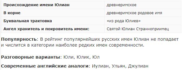 Мужское имя Юлиан возникло много тысячелетий назад и имеет древнеримское, латинское происхождение. Тесно связано с именами Джулиан и Иулиан. Имеет буквальную трактовку «юлианец» или же «представитель рода Юлиев». Может являться одной из форм древнеримского имени Юлий, распространенного во время правительства Цезаря. Среди русскоязычного населения популярностью не пользуется, зато во многих европейских странах встречается довольно часто. Имя Юлиан не только необычное по звучанию, но и невероятно интересное, влиятельное по значению и определению характера. Имеет чудесную совместимость с множеством женских русских имен. СМОТРИТЕ ВИДЕО - ПОДРОБНЕЕ ТУТ Источник - Значение имени Юлиан: карма, характер и судьба