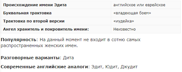Женское имя Эдита имеет несколько вариантов происхождения. По первой версии, происхождение английское, предположительно имя использовалось в Англии в Средневековье. Его распространенная трактовка «владеющая боем». Вторая версия склоняется к древнееврейскому происхождению и связана с именем Юдифь, что в переводе с иврита означает «иудейка». Все Эдиты, как правило, нерешительны, застенчивы, наивны, неуверенны в себе, обидчивы и очень восприимчивы. Но зато в значении имени Эдита есть и сильные черты характера: целеустремленность, подвижность, настырность, энергичность, что позволяет его носительницам успешно бороться с собственными недостатками. СМОТРИТЕ ВИДЕО - ПОДРОБНЕЕ ТУТ Источник - Значение имени Эдита: карма, характер и судьба