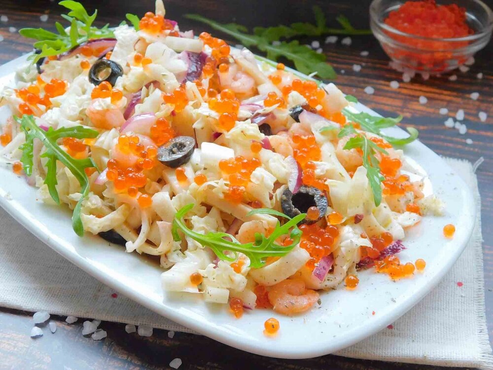 12. Салат с креветками и кальмарами готов. Осталось выложить его на тарелку и распределить сверху красную икру.