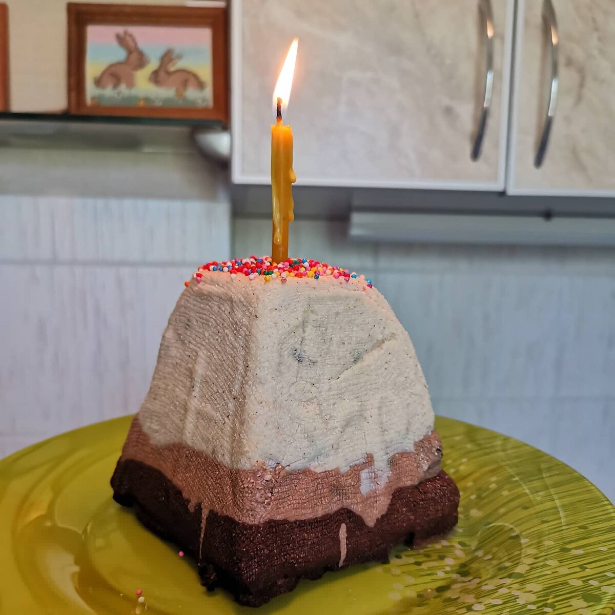 Как и обещала, делюсь с Вами рецептом вкусняшки. Я назвала её "шоколадно-твороженный брауни". На основе этого же рецепта можно делать твороженную паску. Для этого потребуется: 1. Творог (1000 гр) - лучше брать на развес 9%. 2. Сливки, жирностью от 30% (500 гр) 3. Масло сливочное (90 гр) 4. Плитка белого шоколада (100 гр) 5. Плитка молочного шоколада (100 гр) 6. Плитка тёмного шоколада (100 гр) 7. Сахарная пудра (200 гр) - лучше со вкусом ванили, если же такую не найдёте, то 8. Ванильный сахар (2 ч.л.) Не обязательно, но по вкусу можно взять: Изюм (хорошо будет для паски), Дробленный миндаль, Кокос, Абрикос сушенный. Способ приготовления : Выкладываем творог в ёмкость с высокими краями и измельчаем блендером до сметанообразного состояния, потом вливаем сливки и ещё раз блендером все хорошенько взбиваем. Добавляем ванильную сахарную пудру или просто сахарную пудру и ванильный сахар в указанных выше пропорциях, все перемешиваем блендером. (Если для паски, то потом добавляем распаренны