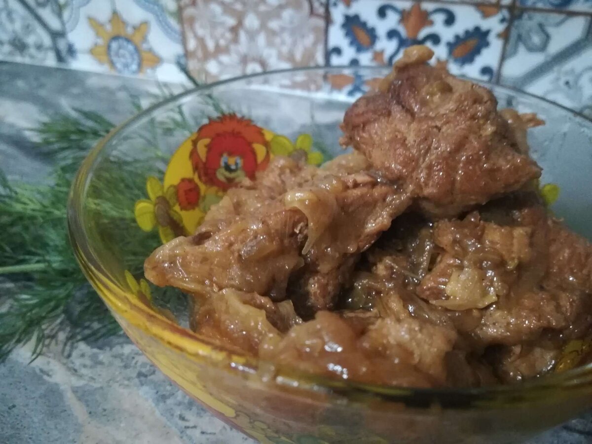 Такое мясо получается очень мягким, нежным со сладковатым вкусом. Идеально сочетается с рисом Нам понадобится: 1 кг говядины 1,5 кг лука 2 столовые ложки корицы щепотка черного перца 1 столовая ложка соли Как приготовить: 1) Порезать мясо на кубики со стороной примерно 3 см 2) Порезать лук полукольцами 3) В кастрюле хорошо нагреть растительное масло (его должно быть достаточно много, чтобы закрывало дно примерно на 5 мм в высоту) 4) На большом огне немного обжарить каждый кусок мяса в масле. Не нужно выкладывать все куски сразу, обжаривать небольшими порциями, чтобы при обжарке из мяса не успел вытечь сок. Каждую обжаренную порцию перекладываем на тарелку 5) Наливаем немного масла и кладем в кастрюлю лук и немного обжариваем 6) Добавляем к луку обжаренное мясо, немного убавляем огонь, чтобы он был не самый большой, но больше среднего и жарим под крышкой, постоянно помешивая до полного испарения воды (той, которая будет выделяться из мяса и лука при жарке) 7) После этого добавляем чер
