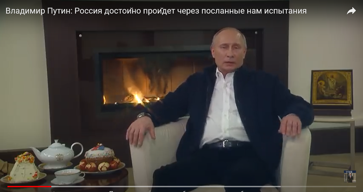Как обычно, в пасхальном послании президента РФ, ничего особенного не было. Неестественная домашняя обстановка «бункера», больше напоминала казарменный порядок с дорогой мебелью, столовым сервизом на одну персону. Растопленный камин, должен был символизировать домашний очаг и теплоту «послания». Но у меня он, выполненный в темных тонах и строгих прямоугольных формах, вызвал скорее обратную ассоциацию - огонь для грешника. За спиной президента, на табуретке (подставке) стояла, принесенная неведомо откуда, икона. В детстве, моя мама, для красоты и блеска, смазывала растительным маслом пасхальные яйца. У Путина было все наоборот - яйца не блестели, в отличии от его лица и головы, - не очень приятное зрелище для мужчины, тем более полковника. Сам он, как и камин, сидел в черных брюках и темном джемпере - домашнего уюта и тепла ему как-бы не хватало. Все как обычно - полная «БУТОФОРИЯ» или сплошная ИМИТАЦИЯ праздника. К обстановке «бункера», имеющего огромное символическое значение для самого Путина, мы вернемся в конце статьи. Предлагаю более детально остановиться на определенных высказываниях президента,