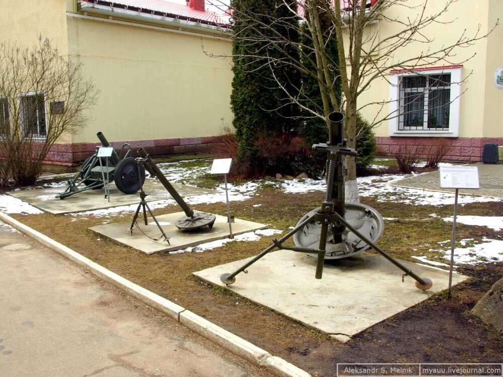 Три миномёта из коллекции Ленино-Снегирёвского военно-исторического музея. Скромная экспозиция начинается со 120-мм полкового миномёта образца 1938 года ПМ-38. Он развёрнут в боевое положение, установлены двунога и плита. Удивляет отсутствие устройства блокировки двойного заряжания на дульном срезе, которое по инструкции по эксплуатации к подобным миномётам должно быть надето на ствол всё время, за исключением периода техобслуживания и ремонта. Следующий экспонат - 82-мм батальонный миномёт образца 1937 года БМ-37. Так же в боевом положении и так же без блокировки на дульном срезе. Третий миномёт - 120-мм полковой миномёт образца 1943 года. Это модернизированная версия миномёта ПМ-38. В условиях массового военного выпуска первоначальная конструкция улучшалась и оптимизировалась, что выразилось сначала в создании 120-мм миномёта образца 1941 года, а затем и 1943 года. Важной особенностью ПМ-43 стала возможность замены одного из ключевых элементов оружия - ударника, без разборки мином