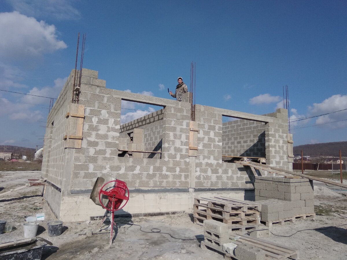 Здравствуйте уважаемые!!! Хочу вам рассказать как я делал перемычки над проемами, после выкладывания блоков одинацатого и двенадцатого рядов. Так я подошел к перемычкам над дверными и оконными проемами. Делал я их неспешно, аккуратно так как занимался этой работой в первый раз. Опалубка: Начал с выставления опалубки, собрал щиты из досок толщиной 25 мм, закрепил их над проемами с помощью дюбель шурупов. По уровню я её не выставлял, выравнивал по верхнему краю блока. Затем собирал днище, также из досок только из пятидесятки, чтобы она не прогнулась. Закреплял к опалубке с помощью саморезов, и выравниванивал по нижнему ряду блоков. Арматура: После выставления опалубки приступил к вязке армакаркаса. Он состоял из металлической арматуры 12 диаметра, по четыре прута на каждую перемычку. Связав каркасы, это не заняло очень много времени, опустил их внутрь опалубки. Для зазора между днищем опалубки и арматурой использовал пластиковые стульчики высотой 2,5 см, удобная штука не надо мудри