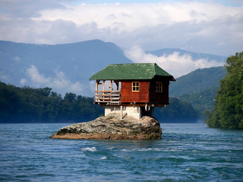 Этот необычный домик расположился аккурат посреди реки Дрина, которая находится в небольшом сербском городке. Удивительно, но строение находится на своём месте уже более 50 лет, несмотря на неоднократное разрушение от полноводий.