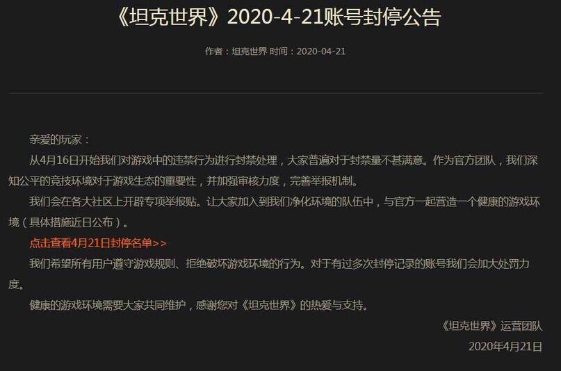 Всем привет. Как вы знаете, 16 апреля на китайских серверах прошла первая волна банов нарушителей правил игры. Было забанено 300 аккаунтов на срок 4-7 дней. Мизерные сроки блокировки и малое количество забаненных аккаунтов вызвали недовольство китайских игроков. И мы негодуем вместе с ними! Ведь после 16 апреля рандом по-прежнему кишел ботами. И вот, спустя неделю, свежая новость от компании Wargaming, касающаяся китайского сервера: Уважаемые пользователи: С 16 апреля мы запретили нелегальное поведение в игре, и все не удовлетворены этим запретом. Как официальная команда, мы хорошо понимаем важность честной конкурентной среды для игровой экосистемы и усиливаем наши обзоры, чтобы улучшить механизм отчетности. Мы разработаем специальные посты в основных сообществах. Пусть каждый присоединится к нашей команде, чтобы очистить окружающую среду и работать с официальными лицами, чтобы создать здоровую игровую среду (конкретные меры были объявлены недавно). На этот раз мы заблокировали 1059