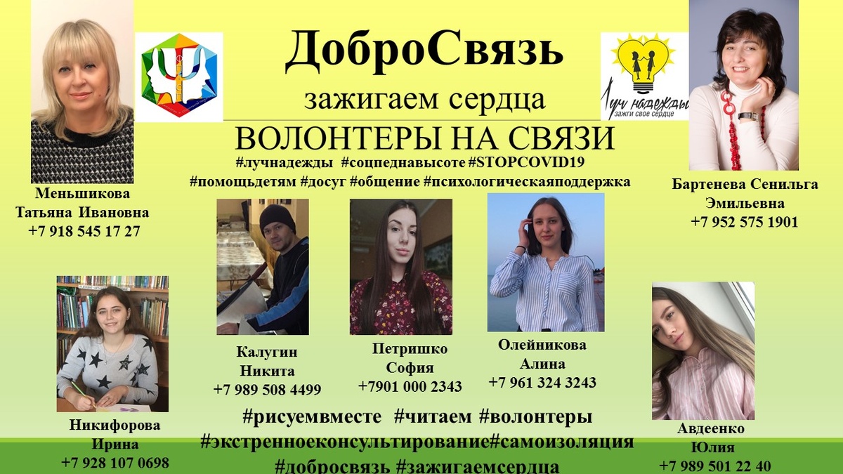 Проект осуществляется некоммерческой организацией «Луч надежды» и таганрогским педагогическим институтом им. А.П. Чехова. В рамках проекта предполагается оказывать бесплатные услуги для детей, родителей, пожилых людей. Суть проекта состоит в том, что в том, что любой из горожан может позвонить и пообщаться с волонтерами. Особенно важна эта связь для детей с особенностями в развития. В проекте участвуют доцент кафедры психологии Татьяна Меньшикова и студенты факультета психологии и социальной педагогики. https://vk.com/taganrogtvttc https://taganrogtv.ru/