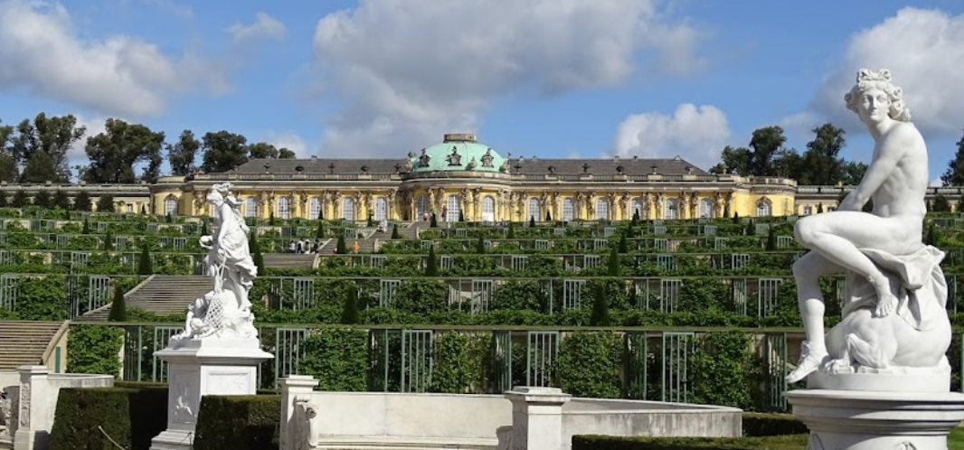 Дворец Сан-Суси (Schloss Sanssouci) расположен на окраине города Потсдам, примерно в 3,5 милях от Берлина в немецкой федеральной земле Бранденбург. Когда Фридрих II Прусский (Фридрих Великий) стал регентом Пруссии в 1740 году, он начал преобразование ландшафта Потсдама, которое продлилось сто лет. Фредрик хотел построить частную резиденцию, где он мог бы отдыхать от всей берлинской роскоши и забот. Сан-суси в переводе с французского означает «беззаботный». Таким образом, это название символизировало, что дворец был местом отдыха, куда мог на время переселиться Фридрих. Фридрих поручил архитектору Георгу фон Кнобельсдорфу спроектировать Сан-Суси, хотя он сам набросал рисунок дворца. Дворец был построен в 1745-1747 годах. Однако из-за разногласий по поводу того, где в парке должно располагаться строение, Кнобельсдорф был уволен и заменен голландским архитектором Иоганном Буманном, который завершил проект Сан-суси. Дворец расположилсяя на террасированном холме в центре парка. Здание не