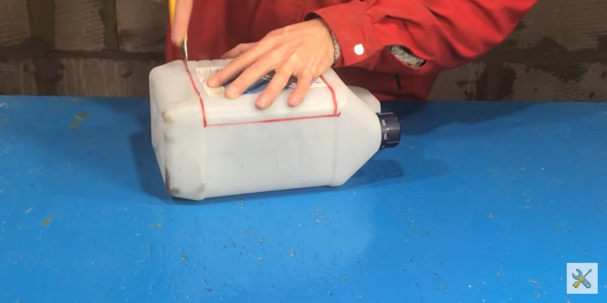 Всем привет друзья сегодня мы будем делать очередную самоделку из пластиковой канистры, которая по любому может пригодиться в мастерской или в гараже. 1 Прорезаем канистру. Вот так должно получиться 2 Шкурим края канистры. 3 Берём небольшой брусочек такой же длинны как длинна боковых пропилов. В моем случае 7 см. Я пилю два бруска по 7 см. Просверливаем в каждом из брусочков два не больших отверстия. Вот так должно получиться 4 Крепим эти брусочки к канистре 5 Изменяем расстояния между брусками с внутренней стороны 5 Берём кусочек ламината и пилим такой же длинны и высоты, что бы канистра делилась на две равные части. Закрепляем эту перегородку саморезами. 6 Делаем полочку под столом. Теперь ставим в эту полку нашу канистру. Все полка готова. Я её использую для всякой мелочи.