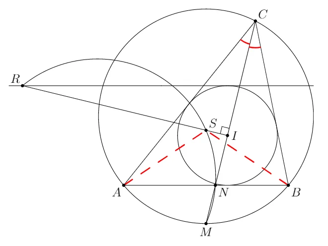 Теперь уж все про точку R понятно! Отрезок прямой NI, лежащий внутри полосы, делится точкой I пополам, поэтому из симметрии прямая NR тоже является касательной к вписанной окружности!! Это ключевое наблюдение в задаче. Дальше она раскручивается очень быстро.