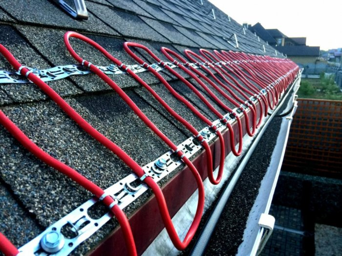 Основная задача, которую решает установка антиобледенительной системы кровли, — создание условий для свободного стока вод, образующихся при таянии снега. Для обеспечения эффективного отвода талых вод греющий кабель прокладывают в местах наибольшего риска образования наледи: по краю кровли, в желобах, ендовах, водосточных трубах. Общее количество материалов для всей системы антиобледенения рассчитывается суммированием всех элементов кровли, требующих обогрева. На кровлях с крутыми скатами (угол наклона более 45°) существует риск лавинообразного схода снежных и ледяных масс. Поэтому на таких крышах необходимо устанавливать снегозадержатели. В таких случаях кабель прокладывают змейкой между снегозадержателем и краем кровли. Ширина змейки из греющего кабеля определяется шириной карниза.