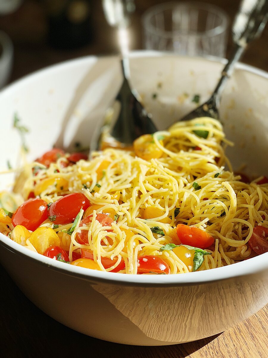 Макароны с разноцветной заправкой Секрет пасты в заправке. Ее нужно поставить мариноваться заранее. Блюдо подходит для летних обедов всей семьей, его подают и теплым и холодным. Ингредиенты – итальянская классика, поэтому рецепт понравится всем. Главное: соблюдать пропорции. Ингредиенты: Шаг 1 Для заправки мелко порубите чеснок. Половину свежего базилика тонко нашинкуйте, оставшуюся половину базилика отделите от стеблей и отложите в сторону для украшения. Шаг 2 В глубокую миску переложите порезанные пополам помидоры черри. Паста получится еще необычнее, если найти бурые и оранжевые томаты. Добавьте в них измельченный чеснок и базилик, соль, перец и оливковое масло. Шаг 3 Накройте смесь полиэтиленовой пленкой и поставьте в место с комнатной температурой. Заправка будет готова через 2 часа: за это время овощные соки перемешаются, аромат чеснока и базилика раскроется и возведет блюдо в ранг ресторанного шедевра. Шаг 4 На мелкой терке натрите пармезан. В идеале использовать кусковой перед