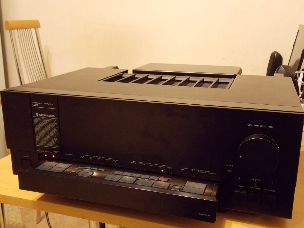 Kenwood L-02А - пишут, что лучший усилитель фирмы, выпускался с начала 80-х годов и, как везде указывают, только для внутреннего японского рынка. В этом я не уверен, потому что скачанный с сети сервис мануал на немецком языке и со схемой БП, на которой указаны напряжения питания 100 В, 120 В, 220 В и 240 В с соответствующим переключателем. Kenwood L-02А попадается на аукционах крайне редко и цена на него высокая, обычно. Аппарат и в 1982 году стоил не мало: 550000¥, что составляло на тот момент более 2200 $ США (по имеющейся у меня таблице, курс в 1982 году был 249 ¥ за 1 $ США). Попавший ко мне усилитель был для Японии, с питанием только 100 В.