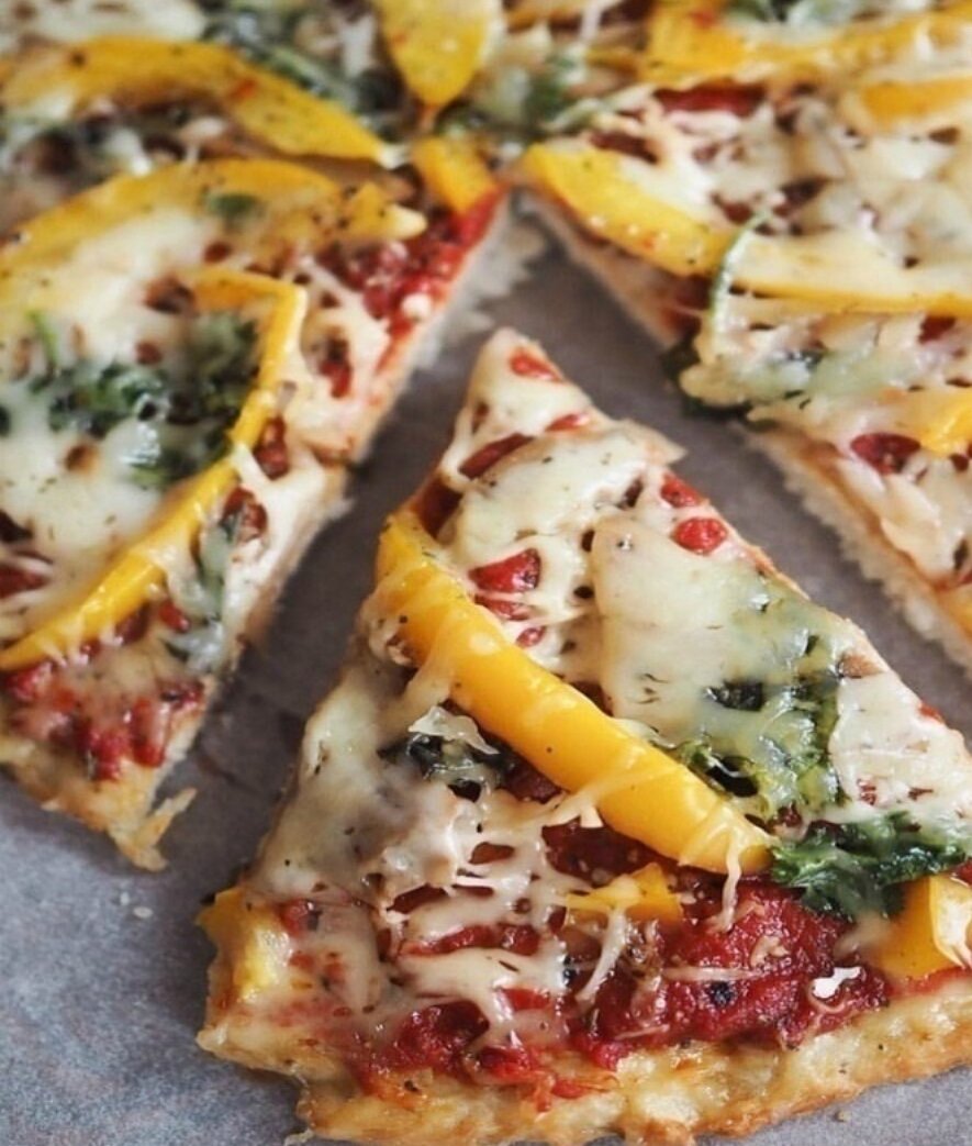 Её можно есть даже на ночь! Ведь тесто готовится из куриной грудки и без грамма муки. 🔸на 100грамм - 113.188 ккал🔸Б/Ж/У - 14.25/4.2/4.49🔸 Ингредиенты(на 8 порций): Основа: Куриная грудка – 250 г Яйцо – 1 шт. Отруби овсяные – 20 г Соль – по вкусу Соус: Томатная паста – 50 г Вода – 50 г Оливковое масло – 5 г Лук – 1/2 шт. Специи – по вкусу Соль – по вкусу Начинка: Овощи – 100 г Сыр – 50 г За рецепт спасибо группе Диетические рецепты Приготовление: 1. Куриную грудку нарезаем на небольшие кусочки, смешиваем с яйцом, отрубями, солью и измельчаем блендером до полной однородности. 2. Выкладываем основу в виде круга на пергаментную бумагу или силиконовый коврик. 3. Выпекаем в разогретой до 180 градусов духовке около 20 минут. 4. Для соуса лук очень мелко нарезаем. На сковороду наливаем немного масла и обжариваем лук до золотистого цвета. 5. Смешиваем воду с томатной пастой. Выливаем смесь к луку, хорошо перемешиваем и ждем, когда лишняя жидкость выпарится. Приправляем по вкусу. Мне оче