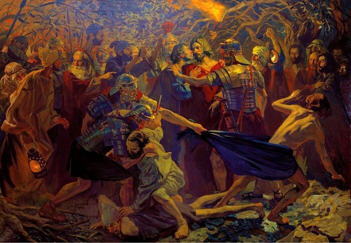 И вот, отряд «воинов и служителей» уже совсем рядом, так что и дураку ясно, что не погулять они сюда пришли. От вооруженной толпы отделяется Иуда и, с криком «…радуйся Равви!..» (Матфей:26-49), целует его.
