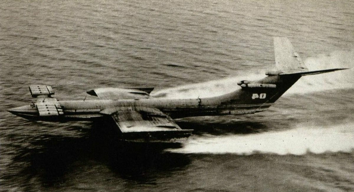 В 1964-1965 годах советские конструкторы под руководством Р. Е. Алексеева осуществляли проектирование и создание уникального в своем роде транспортного средства. Не корабль и не самолет. Это был экраноплан. Экраноплан перемещается на высоте 2-4 метров над поверхностью воды, в воздухе держится за счет создания подъемной силы крылом и экранного эффекта. В 1966 году прошли первые испытания экспериментального экраноплана в Каспийском море. На борту были написаны буквы "КМ", что значило "корабль-макет", но за свой устрашающий вид на Западе экраноплан получил прозвище "Каспийский монстр". КМ имел целых 10 двигателей: 8 находились в передней части и отвечали за создание стартовой мощности, а еще 2 в задней части поддерживали крейсерскую скорость. Он был огромных размеров: 92 метра в длину, 21,8 в высоту, размах крыла 37,6 метра. Максимальная взлетная масса составляла 544 тонны, что до появления Ан-225 "Мрия" было абсолютным рекордом. Над водой "Каспийский монстр"мог перемещаться со скорость