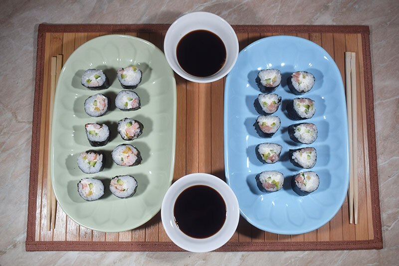 Примерное КБЖУ на 100 грамм блюда: для роллов с рыбой: 170 ккал; Б - 8,3 г; Ж - 10 г; У - 11,7 г. для роллов с креветками: 140 ккал; Б - 9 г; Ж - 6,8 г; У - 10,4 г. Ингредиенты: Основа: - рис для суши - 120 г; - вода - 210 мл; - соль - 0,5 г; - сахарный песок - 5 г; - рисовый уксус - 1 ст ложка; - листья нори - 2 шт. Для начинки: - сливочный творожный сыр для суши - 160 г; - сёмга слабосоленая - 100 г; - креветки - 150 г; - свежий огурец - 1 шт; - свежее авокадо - 75 г. Способ приготовления: Подготавливаем рис Для начала готовим заправку: в небольшой ёмкости смешиваем уксус, соль, сахара и хорошо перемешиваем (твёрдые ингредиенты должны полностью раствориться). Рис для суши хорошо промываем, заливаем водой и отправляем вариться на умеренном огне под крышкой. Как только вода закипит, уменьшаем огонь до минимального режима и варим 12 - 15 минут (не поднимайте крышку при варке). После убираем рис с огня, снимаем крышку, накрываем кухонным полотенцем и снова плотно закрываем крышкой, оста