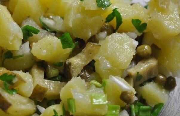 Такой салат можно приготовить и с маринованными огурцами, и с солеными. Просто отварите картофель, лучше варить его "в мундире", нарежьте на кусочки, и смешайте с маринованными, либо солеными огурчиками, также мелко нарезанными. В салат можно добавить консервированный зеленый горошек и свежую зелень. Заправить салат растительным маслом. Хорошо добавить в салат немного черного перца и чеснока. Приятного аппетита!