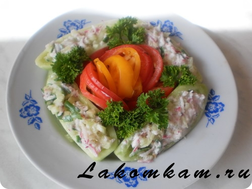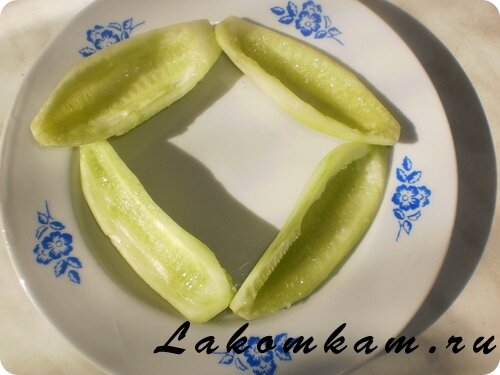 Блюдо из овощей «Лодочки из огурцов». Приготовление. Огурцы моем, разрезаем каждый вдоль пополам, удаляем сердцевину.