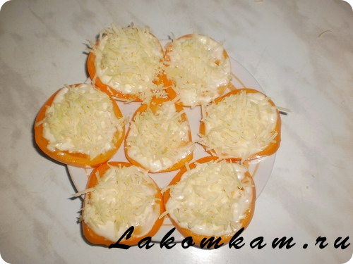 Помидоры мажем майонезом с чесноком.