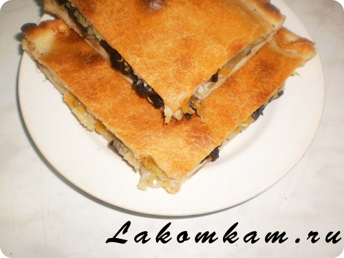Выпечка «Пирог с капустой и грибами». Ингредиенты. Для теста: 600 грамм муки; пол стакана воды; 100 грамм растительного масла; 25 грамм дрожжей; 2 чайные ложки соли; 1 чайная ложка сахара. Для начинки: 500 грамм капусты; 1 луковица; 1 морковь; 200 грамм свежих грибов; соль; чёрный перец молотый; растительное масло.